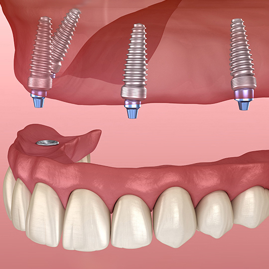 「オールオンX」とは、少ない本数のインプラントで、多数の人工の歯を固定する治療法の総称です。