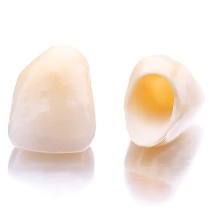 リスクや副作用:リスクや副作用:型どりの際に歯を削る必要があり、治療時に出血を伴うことがあります。歯の状態によっては神経の治療が必要になる場合があります。また、装着後に噛み合わせの不具合で違和感が生じる場合や、歯ぎしりや噛み締めによる過度な力で割れるリスクがあります。