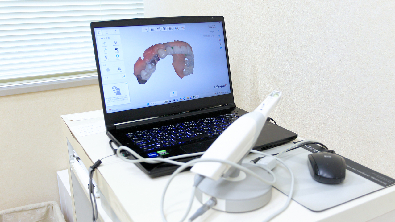 当院では、最新機器「口腔内スキャナー」を導入しています。口腔内スキャナーとは、専用カメラで撮影し、取得した画像をコンピューター上で解析するだけでお口の型どりができる機器です。